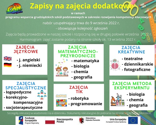 W dniach 2.09 - 09.09.2022 r. odbędzie się rekrutacja uzupełniająca na zajęcia realizowane w ramach projektu „Program wsparcia grudziądzkich szkół podstawowych w zakresie rozwijania kompetencji kluczowych ”.